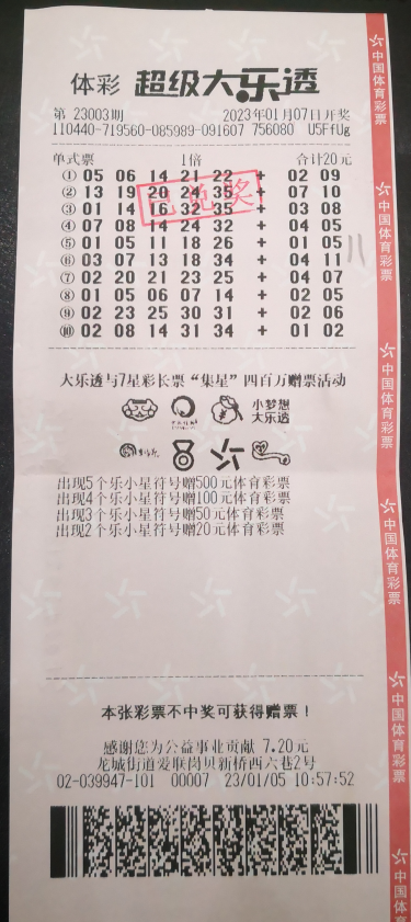 1月7日,体彩超级大乐透第23003期开奖,全国中出2注1800万元追加一等奖,4注1000万元基本一等奖。其中,深圳中出1注基本一等奖,中奖者投注金额为20元,在喜中1000万元的同时,为社会贡献个人偶然所得税200万元。