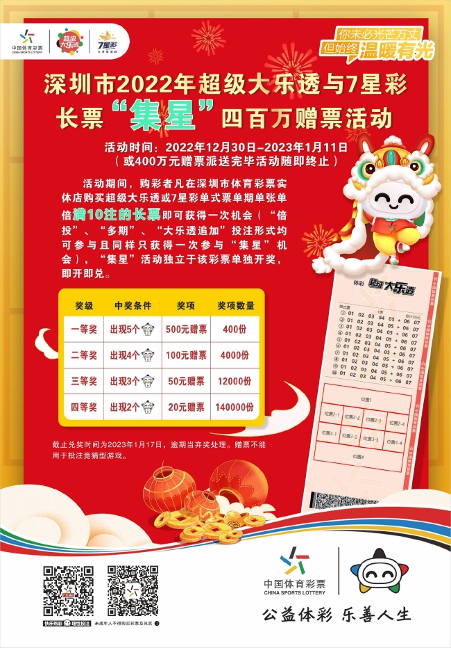 与此同时,深圳体彩现正开展“集星赠票”活动,原计划于1月11日结束,现特延长至1月18日结束。在此期间,购彩者凡在深圳区域内购买超级大乐透或7星彩单式票单张单倍满10注,如票面出现2个-5个乐小星标志,即可相应获得20元-500元的赠票。