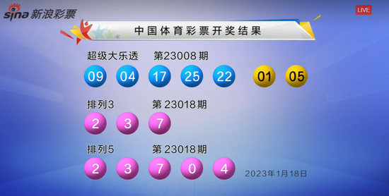 北京时间1月18日晚,体彩大乐透第23008期开奖,当期开奖号码为:前区04 09 17 22 25,后区01 05。本期全国销量为3.22亿元,为国家筹集彩票公益金1.16亿元。