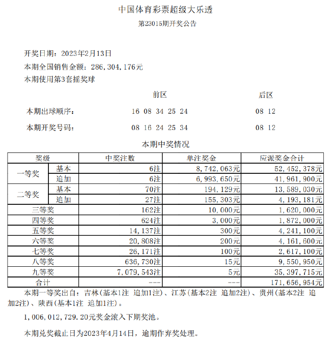 体彩开奖北京时间2月13日晚,体彩大乐透第23015期开奖。当期开奖号码为:前区08 16 24 25 34,后区08 12。