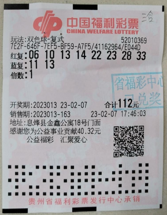 2月7日,双色球第2023013期开奖,开出奖号红号06、10、14、22、23、33,蓝球13,一等奖开出2注,单注奖金1000万元,由贵州和安徽彩民收获。贵州的一等奖由贵阳市息烽县彩民收获,中奖彩票一张8+2复式票,该张彩票除中得1注一等奖外,还中得1注二等奖、12注三等奖、27注四等奖和15注五等奖,累计获得奖金1035万元。