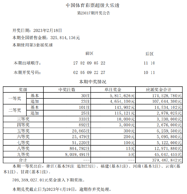 北京时间2月18日晚,体彩大乐透第23017期开奖。当期开奖号码为:前区02 05 09 22 27,后区10 11。本期头奖开出30注,其中23注选择追加,单注追加头奖达到1047万余元,浙江独揽这23注。经检索,23注追加头奖均出自浙江宁波,中奖彩票是一张1注号码、23倍投注、69元投入的单式追加倍投票,单票擒奖2.40亿元!
