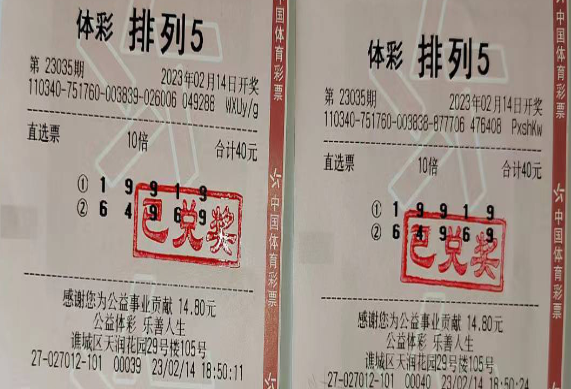 据该店销售员介绍,中奖者赵先生是住在附近的资深购彩者,经常来店里购彩,在体彩众玩法中,唯独青睐“排列5”玩法。仔细看购彩者张先生(化姓)带来的“排列5”中奖票,是两张一模一样的10倍倍投直选票,票面第二注号码与第23035期“排列5”开奖号码相同。