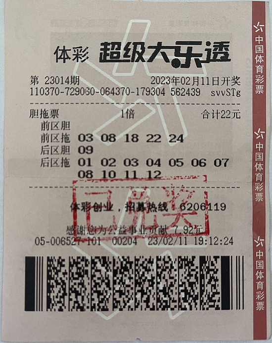 2月11日,超级大乐透第23014期开奖,前区号码“03、08、18、22、24”,后区号码“01、09”,正是霍先生编辑的这组号码,获得了一等奖一注,二等奖十注,总奖金1085万元。