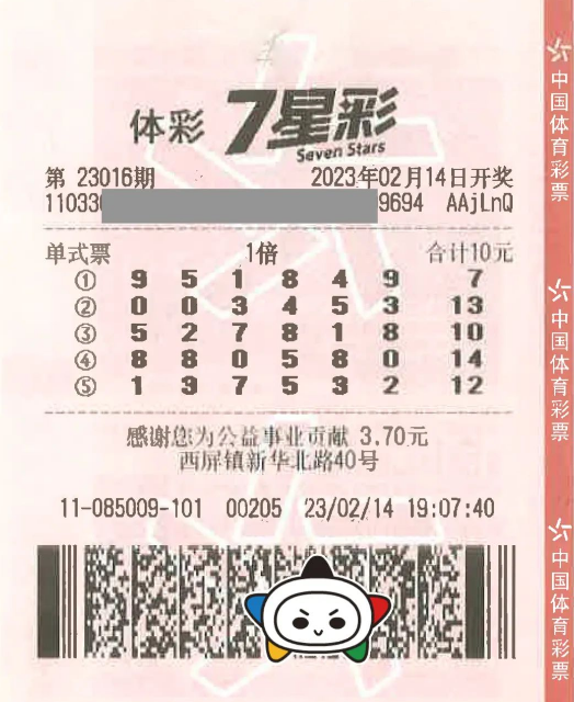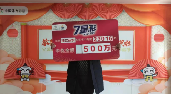 2月14日,丽水市松阳县西屏镇新华北路40号的3311085009号体彩实体店传来喜讯,一购彩者喜中7星彩第23016期一等奖500万元。中奖彩票为一张10元5注的单式票,其中第3注中得本期一等奖,单票擒获500万元。