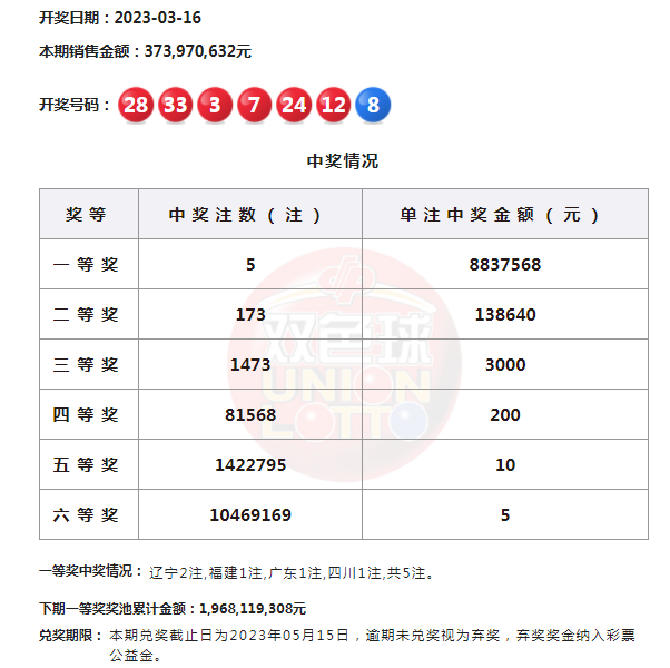 22:30 本期一等奖开出5注,单注奖金883万元。其中辽宁中出2注,福建、广东、四川各1注。二等奖开出173注,单注奖金13.8万余元。本期双色球全国销售金额为3.73亿元,计奖结束后奖池余额19.68亿元。