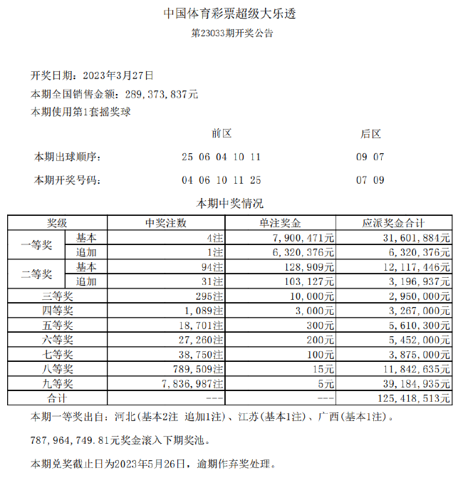体彩开奖北京时间3月27日晚,体彩大乐透第23033期开奖,当期开奖号码为:前区04 06 10 11 25,后区07 09。