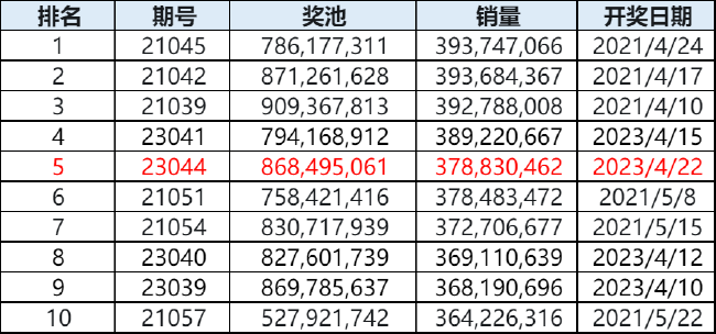 北京时间4月22日晚,体彩大乐透第23044期开奖,同时本期也是大乐透10亿大派奖的第6期开奖。当期开奖号码为:前区02 06 07 08 15,后区07 10。值得注意的是,本期大乐透销量为378,830,462元,超越第21051期开奖,暂时位列历史第5!