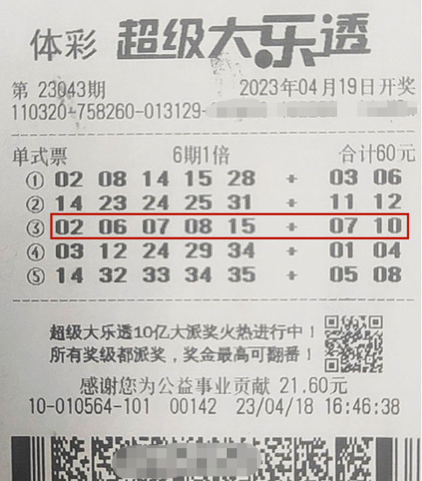 就在十多年前,罗先生锁定了大乐透5注号码开始长期守号,无论期间是否中奖他都不曾更换,这份坚持也最终给他带来了惊喜。4月22日,大乐透23044期开奖,罗先生的第3注号码“02、06、07、08、15+07、10”正是当期的中奖号码,奖金高达1000万元,此外第1注号码也中了5元的小奖。