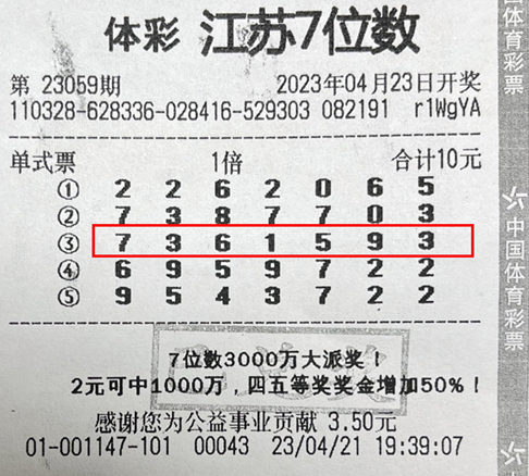 4月23日,江苏体彩7位数第23059期开出中奖号码“7361593”,当期中出特等奖1注,花落南京3201001147体彩网点。由于正值7位数游戏3000万元大派奖活动期间,中奖者徐先生除中得500万元特等奖奖金,还中得了450万元特等奖派奖奖金,单注总奖金950万元。