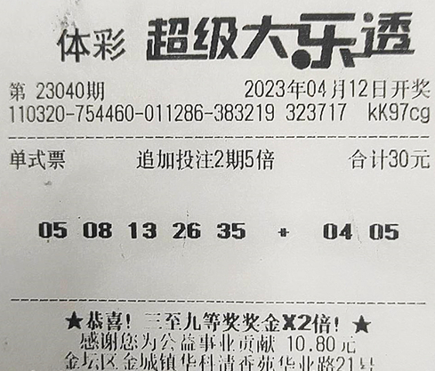 前不久,小沈在父母的陪伴下来到南京领走了这份大奖。据了解,小沈才工作不久,起初不怎么买彩票,但他的母亲是个资深彩友,耳濡目染下小沈也尝试着玩玩,选择的玩法也是母亲喜欢的体彩大乐透,不过他购彩非常有计划,每期只买1注号码并倍投5倍进行守号。今年大乐透10亿大派奖闪亮登场,小沈也不怠慢,几乎每期必买。4月11日这天,小沈还是像往常一样来到3204054674体彩网点,打了1注大乐透号码“05、08、13、26、35+04、05”,并进行2期5倍倍投。销售员一看就提醒他,现在是大乐透派奖期,这张票首先没有追加投注,其次也达不到单张单期15元及以上,不如加个追加,一旦中奖就能享受派奖很划算的。小沈觉得有道理,于是就加个10块钱补个追加。4月15日,大乐透23041期开奖,小沈这张票以一号之差屈居二等奖,但因为这张票满足了派奖条件,从而使自己的奖金升级到百万级,达到了1055105元。