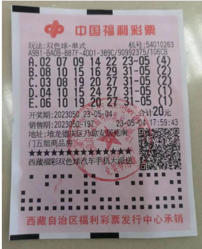 5月4日下午,该彩民在堆龙德庆区乃琼安居苑南门54010263号销售网点采用单式投注的方式自选购买彩票20元。中奖号码:02、07、09、14、22、23-05。