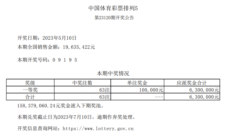 5月11日晚,体彩排列五第2023120期开奖,开奖结果0 9 1 9 5。当期全国井喷排列五头奖63注,单注奖金100000元。当期排列五全国销量19635422元,120期开奖后,下期奖池金额158379060.24元。 >>>排列五往期开奖:历史开奖