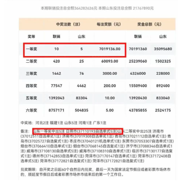 山东一等奖开出5注,均出日照市,二等奖25注分布在十个市。