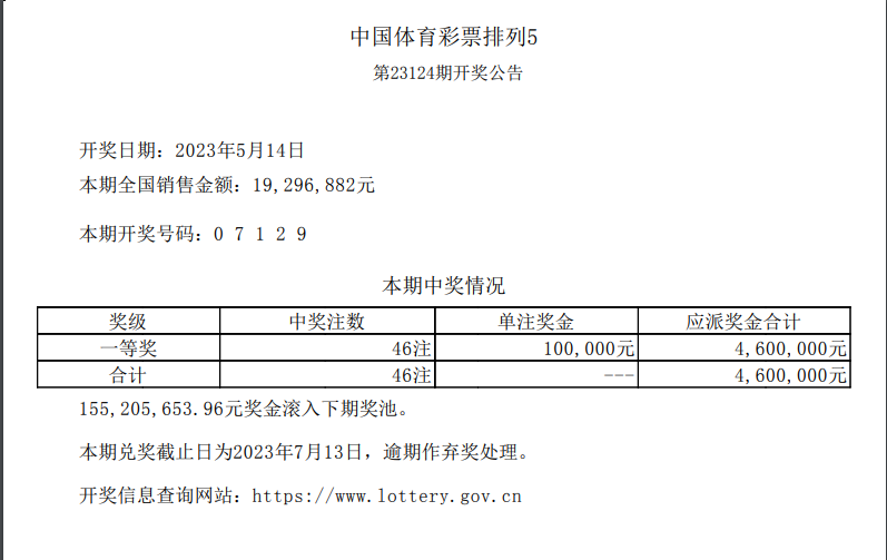 23124期全国销售额19296882元,共中出一等奖46注,单注奖金10万元,合计派奖460万元,开奖后共有155205653.96元奖金滚入下期奖池。