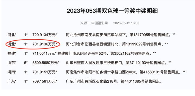 除了河北中2注一等奖外,福建省中1注,山东省中5注,河南省1注,广东省1注。