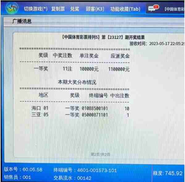 排列五23127期一等奖中出67注,单注奖金100000元。其中, 海南中出11注,海口10注,三亚1注。本期销售额:19,863,224元,奖池滚存:¥144431588.14元。