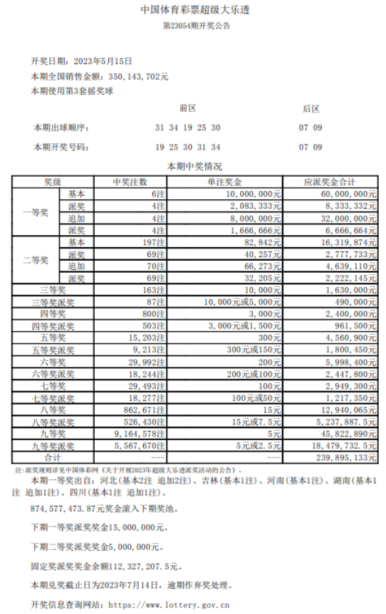 5月15日,体育彩票超级大乐透迎来了“10亿元大派奖”的第16期开奖,即第23054期。在前区号码中,开出了19、25、30、31、34这5个数字;在后区号码中,开出了07、09这2个数字。本期全国销售额达到了3.50亿元,其中1.26亿元将用于彩票公益事业。