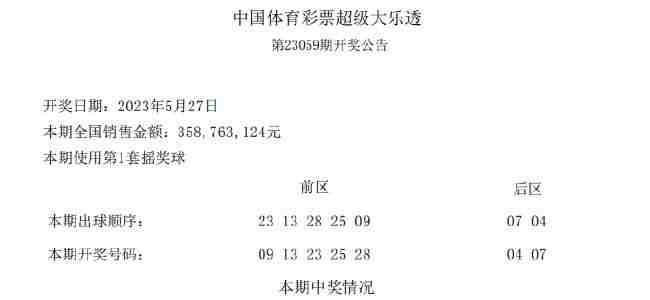 5月27日晚,大乐透23059期开奖号码:09 13 23 25 28+04 07,固定奖派奖奖金余209万全部派出,其他由调节基金补足,2023年大乐透派奖活动正式收官!