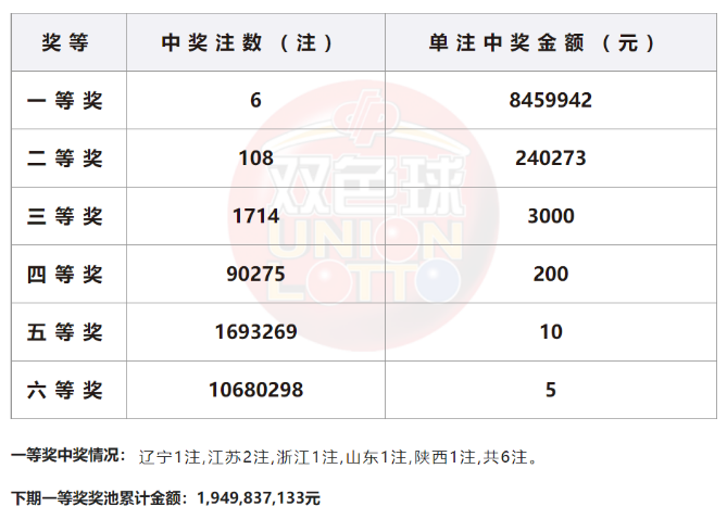 当期全国一等奖开出6注,单注奖金845.99万元,被辽宁、江苏(2注)、浙江、山东和陕西的彩民分享。二等奖开出108注,单注奖金24.02万元。当期销售额4.02亿元,下期一等奖奖池累计金额19.49亿元,仍旧保持在高位运行!