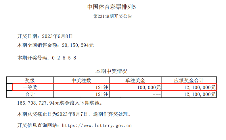 排列五第2023149期全国开出头奖121注,单注奖金100000元,应派奖金额为12100000元。当期兑奖截止日为2023年8月7日,逾期作弃奖处理。排列五第2023149期开奖后,165,708,727.94元奖金滚入下期奖池。