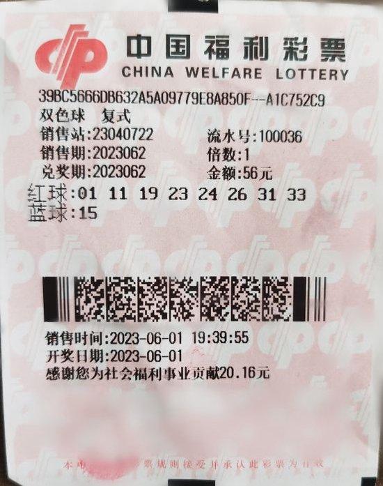 6月1日晚,中国福利彩票双色球游戏进行了第2023062期开奖,当期开出了一注全国唯一的一等奖,奖金为1000万元,中奖号码为11、19、23、24、26、33(红球)和15(蓝球),幸运的中奖者来自黑龙江。