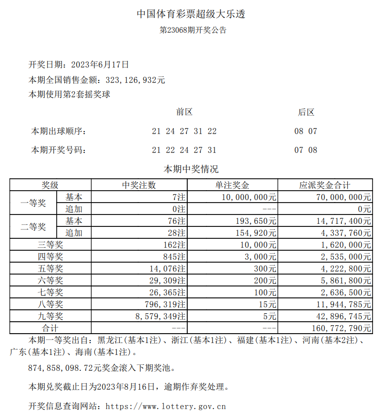 6月17日大乐透23068期开奖号码21 22 24 27 31 + 07 08,当期共开出头奖7注,单注奖金1000万。 海南海口彩民中得头奖1注,奖金合计1000万,中奖站点位于龙华区城西的522号彩票站。