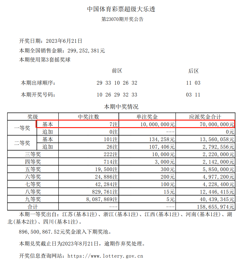 大乐透游戏第23070期全国销售额为299252381元,当期开奖后,下期奖池金额为896,500,867.52元。