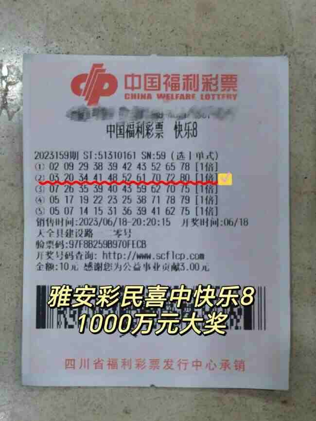 快乐8游戏第2023159期开奖,全国唯一一注“选十中十”花落雅安市天全县建设路120号第51310161号销售网点。除获得500万元单注奖金外,还获得500万元派奖奖金,奖金合计1000万元。这也是雅安市首个快乐8千万大奖。