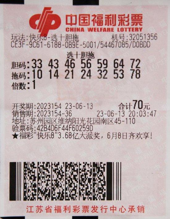 中国福利彩票快乐8游戏第2023154期开奖,号码为10、14、19、24、33、43、44、45、46、47、48、56、59、64、68、70、72 苏州一彩民自选了7个胆码和7个拖码,组成了一张选十胆拖的快8彩票,花费70元,获得了1注“选十中十”(555万多元)、12注“选十中九”(9.6万元)、18注“选十中八”(1.44万元)和4注“选十中七”(320元),共获得奖金566万多元。这是今年以来我省第4注“快乐8”游戏“选十中十”500万元以上大奖。