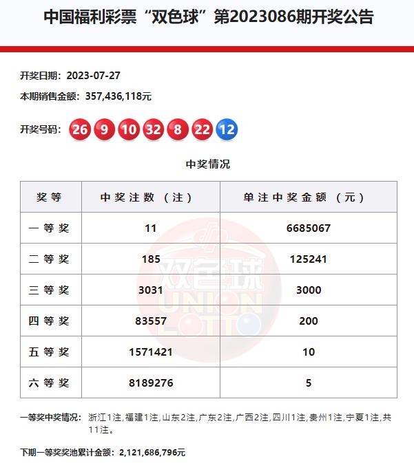 22:30 本期一等奖开出11注,单注奖金668万余元,11注头奖分落全国8地,其中山东、广东、广西中得2注,浙江、福建、四川、贵州、宁夏各收获1注。二等奖开出185注,单注奖金12.5万余元。本期双色球销量为3.57亿元,计奖结束后奖池余额21.21亿元。