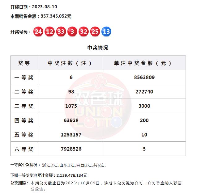 22:20 本期一等奖开出6注,单注奖金856万余元,6注头奖分落3地,其中浙江独揽3注,若为一人所中,则该彩民将收获2569万余元大奖,山东1注,陕西2注。二等奖开出98注,单注奖金27.2万余元。本期双色球销量为3.57亿元,计奖结束后奖池余额21.3亿元。