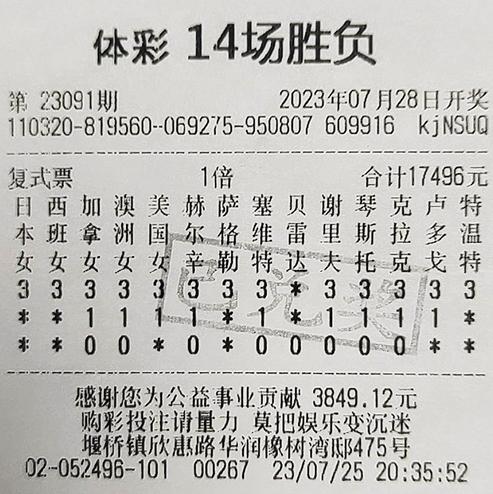 足彩赛事丰富多彩,其中女足世界杯是国内传统足彩的竞猜赛事之一。无锡小伙田先生在胜负彩23091期成功捕捉到女足超级冷门,并一举擒获当期1注一等奖,总奖金达到114万多元。虽然年龄不大,但玩足彩已有几年,此次也是他第一次中出百万大奖。他主要玩的是传统14场胜负游戏和任选9场,一般情况下都是小复式投注。 7月28日,在传统足彩14场胜负游戏23091期开奖时,小田果断采用大复式出击。 本期女足世界杯和欧冠资格赛非常考验玩家对足彩赛事的把握能力。头号冷门是澳大利亚2-3不敌尼日利亚,小田用“3、1、0”拿下。 第二个冷门是赫尔辛基1-0击败莫尔德,小田也用“3、1、0”拿下。 第三个冷门是卢多戈雷1-1与奥林比查打平,小田用“3、1”拿下。他同时中出1注一等奖和16注二等奖,总奖金达到1145932元。