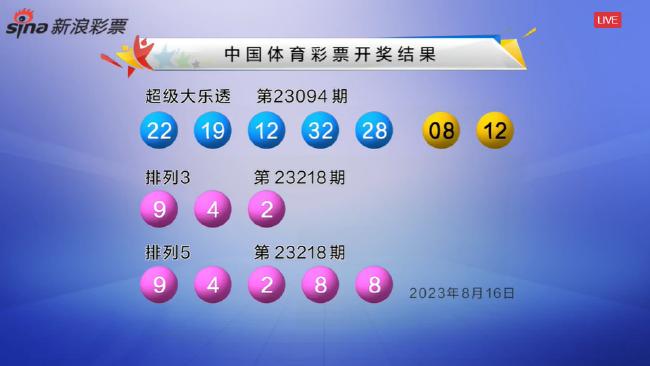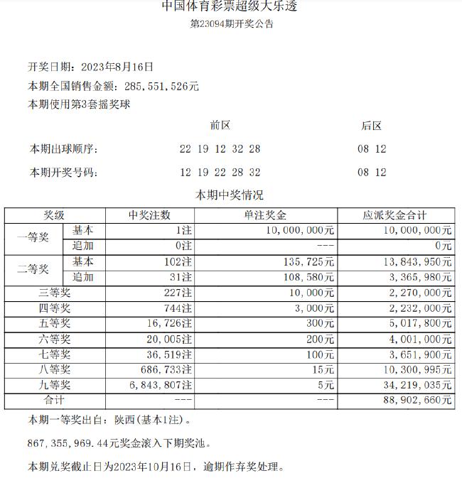 北京时间8月16日晚,体彩大乐透第23094期开奖,当期开奖号码为:前区12 19 22 28 32,后区08 12。