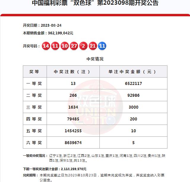 22:10 本期一等奖开出13注,单注奖金652万余元,13注头奖分落全国11地,其中浙江、江西和四川分别中得2注,辽宁、山东、重庆、河南、贵州、陕西和深圳各中得1注。本期双色球全国销售金额为3.62亿元,计奖结束后奖池余额21.18亿元。