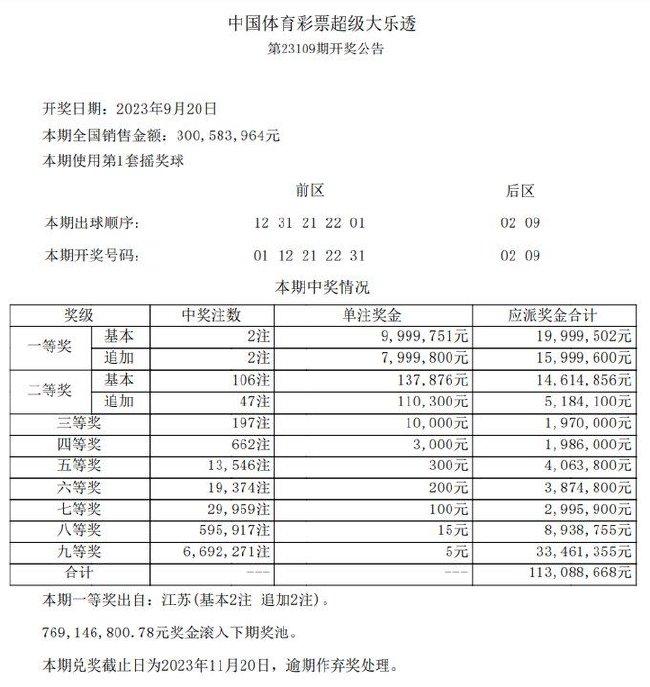 本期开奖后,7.69亿元滚存至9月23日(星期六)开奖的超级大乐透第23110期。