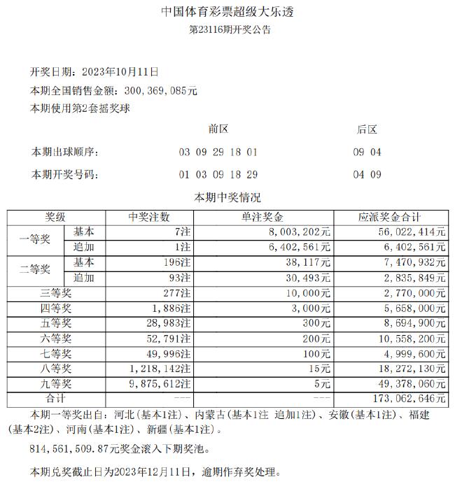 北京时间10月11日晚,体彩大乐透第23116期开奖,当期开奖号码为:前区01 03 09 18 29,后区04 09。本期大乐透全国销量为3亿元,计奖结束后奖池余额8.1亿元。