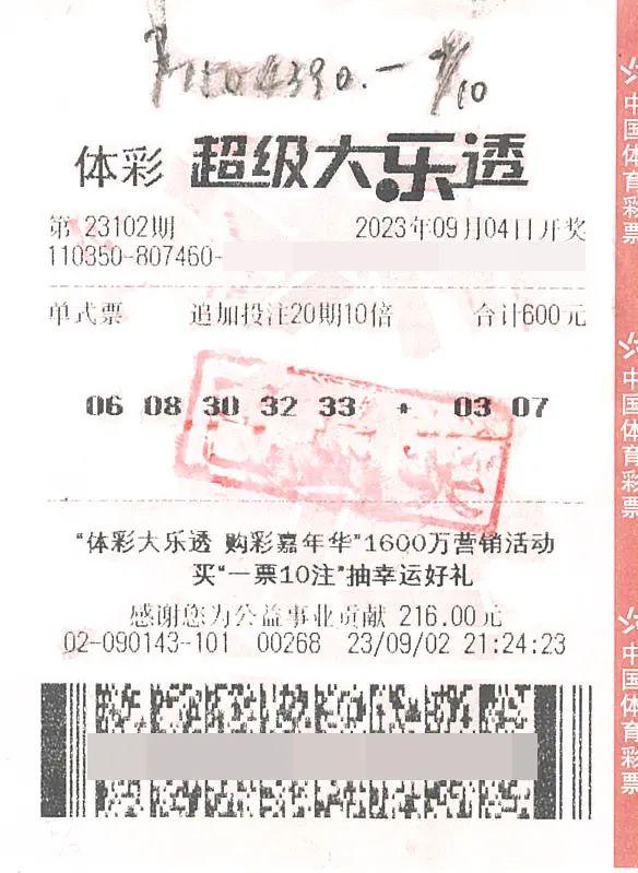 前区是“06、08、30、32、33”,后区是“03、10”。福建厦门,一名彩民在九月份来临之际,以“追加20期10倍”的单式彩票,中了10注超级彩票,获得了150万的奖金。