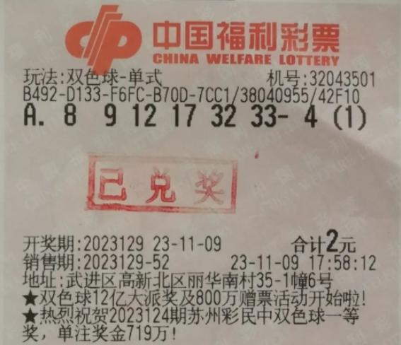 最近,双色球2023129期开出了红球的奖号:08、09、12、17、32、33,蓝色球04。本期共开出了6注一等奖,其中江苏的第一个一等奖花落常州,彩民金小姐凭借一张2元的机器中奖,获得了987万多元的奖金。这张彩票是常州武进区高新北区丽华南村35-1单元6号,号码为32043501,在11月9号下午17:58分12秒出售。