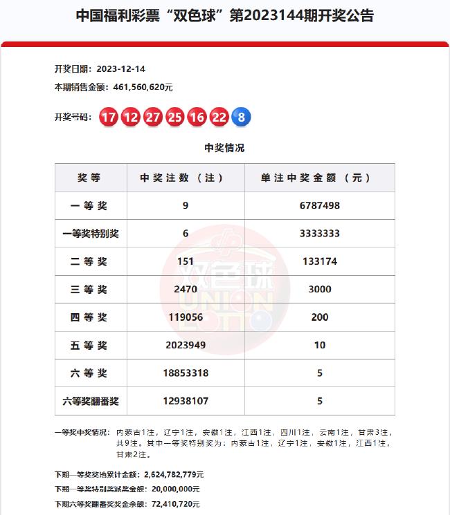 福彩开奖直播截图北京时间12月14日,福彩双色球第23144期开奖,同时本期还是双色球12亿大派奖的第16期开奖。本期一等奖开出9注678万余元,其中6注获得一等奖特别奖加奖333万元,单注奖金达到1012万余元;一等奖特别奖甘肃揽获2注、内蒙古、辽宁、安徽和江西各1注;3注基本头奖分别落于四川、云南和甘肃。二等奖开出151注13.3万余元。本期双色球投注额为461,560,620元;奖池余额为2,624,782,779元,历史第8。