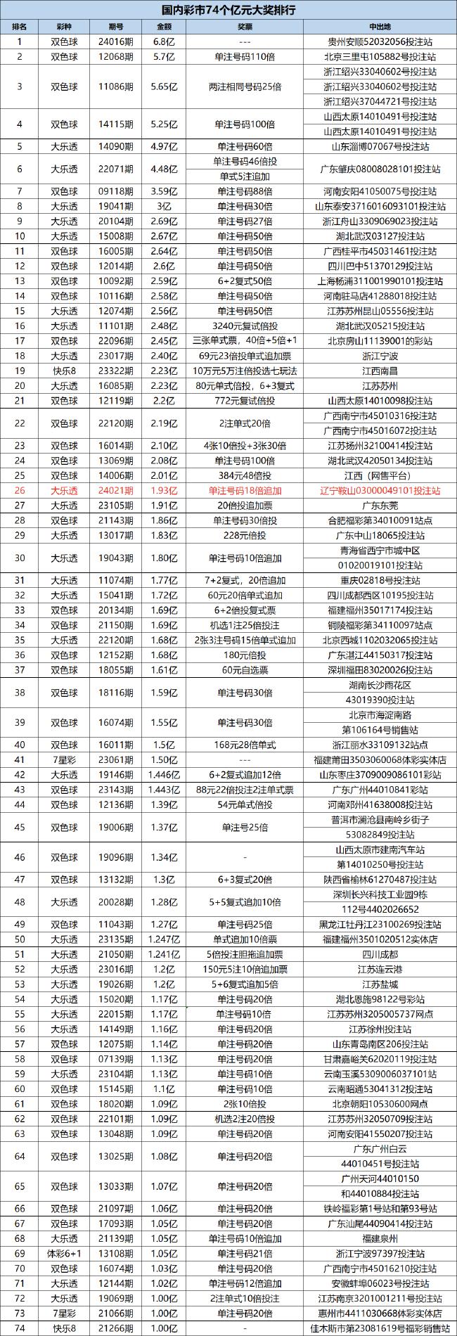这是今年国内彩市开出的第2个亿元奖,距离上一个双色球6.8亿元的巨奖相隔19天,这也是体彩大乐透历史第29次开出亿元大奖,也是今年开出的首个大乐透亿元奖,同时,这是国内彩市开出的第74个亿元奖,本次大乐透玩法1.93亿排名第26位!