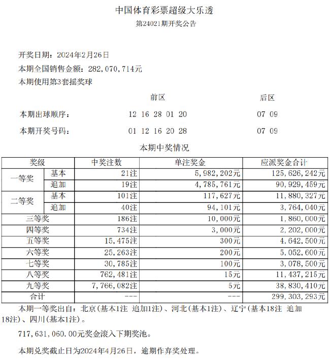 本期全国销量为2.82亿元,为国家筹集彩票公益金1.01亿元。奖池方面,本期开奖结束后,7.17亿元滚存至2月28日(周三)开奖的第24022期。