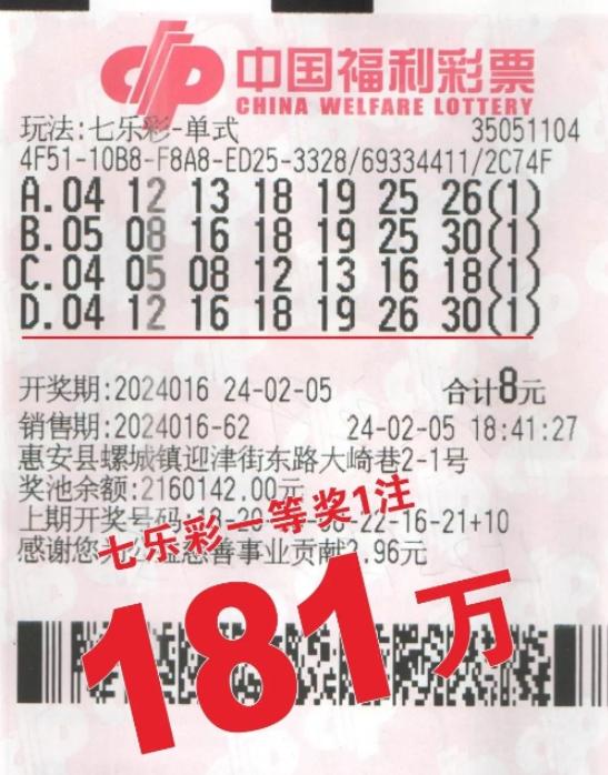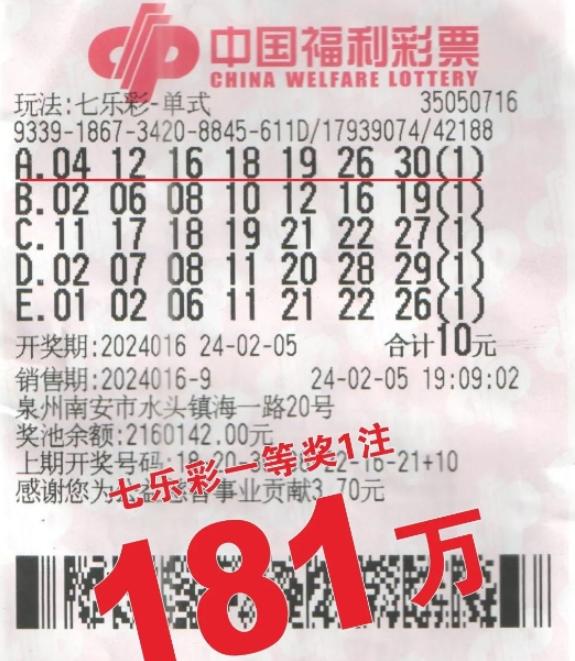 在2月5日晚上开奖的七乐彩第2024016期中,有两注单注奖金超过181万元的一等奖被福建的彩民所中。其中一位幸运儿购买彩票的地点分别是泉州南安市水头镇海一路20号的福彩35050716投注站和泉州市惠安县螺城镇迎津街东路大崎巷2-1号的福彩35051104投注站。在南安市中奖的幸运者吕先生(姓氏已更改)是通过一张10元5注号码的单式彩票赢得的。吕先生表示,这些号码是他多年来一直守号的,那天下午他在南安水头办事时顺便经过投注站,就进去购买了这些号码的彩票。他还提到,并不是每期他都会购买,有时也会忘记,但幸运的是这次他没有错过中大奖的机会。