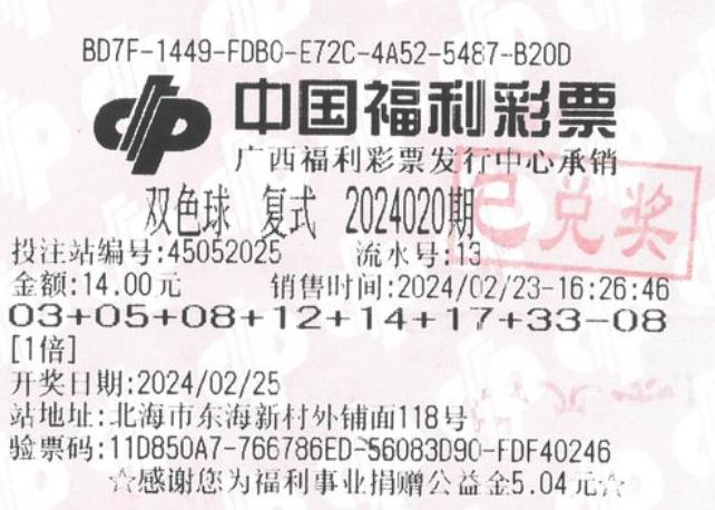 在龙年伊始,广西彩市喜获双色球连中三个一等奖,收获颇丰。2月25日晚,第2024020期双色球揭晓,红球号码为17、12、03、14、33、08,蓝球号码为08。全国共有3注一等奖,其中1注幸运彩票出自广西北海市东海新村第45052025号投注站,奖金高达1000万元。近日,中奖者王先生(化姓)亲临广西福彩中心,领取了他的幸运奖金。80后的王先生在办理兑奖手续时与笔者分享了他的中奖故事。他自参加工作以来已经购彩18年,可以说是福彩的老粉丝了。他购买彩票时更倾向于守号,认为重新选号码比较麻烦,而守号则简单直接。有时候工作忙碌会忘记购买彩票,如果错过了三四期,下一期就会加倍投注。这次中奖号码他从2016年开始就一直守着,期间还中过三万多元的奖金。