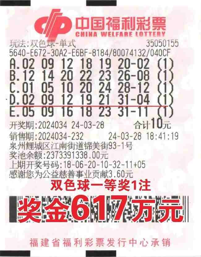 3月28日晚开奖的福彩双色球第2024034期,全国中出17注单注奖金617万多元的一等奖。福建喜获其中1注,大奖花落泉州市鲤城区江南街道锦美街93-1号的福彩35050155投注站,中奖彩票是一张5注号码的单式票。