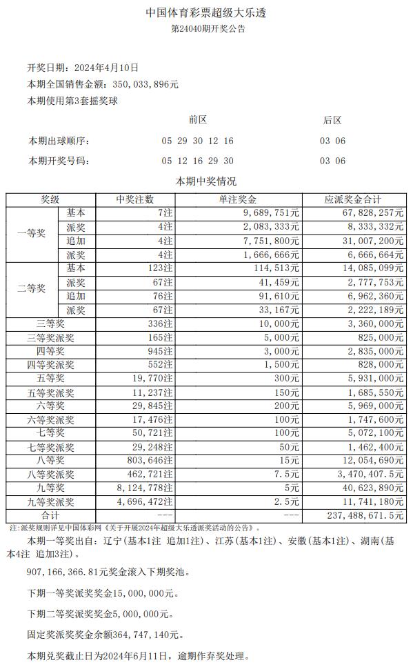 二等奖开出123注,每注基本奖金为11.4万余元;其中76注采用追加投注,多揽9.1万元,单注奖金20.6万余元。本期共有67注二等奖符合本次派奖参与条件,单注奖金为(基本奖金11.4万+追加奖金9.1万+基本奖金派奖4.1万+追加奖金派奖3.3万)28万余元。奖池方面,本期开奖结束后,9.07亿元滚存至4月13日(周六)开奖的第24041期。