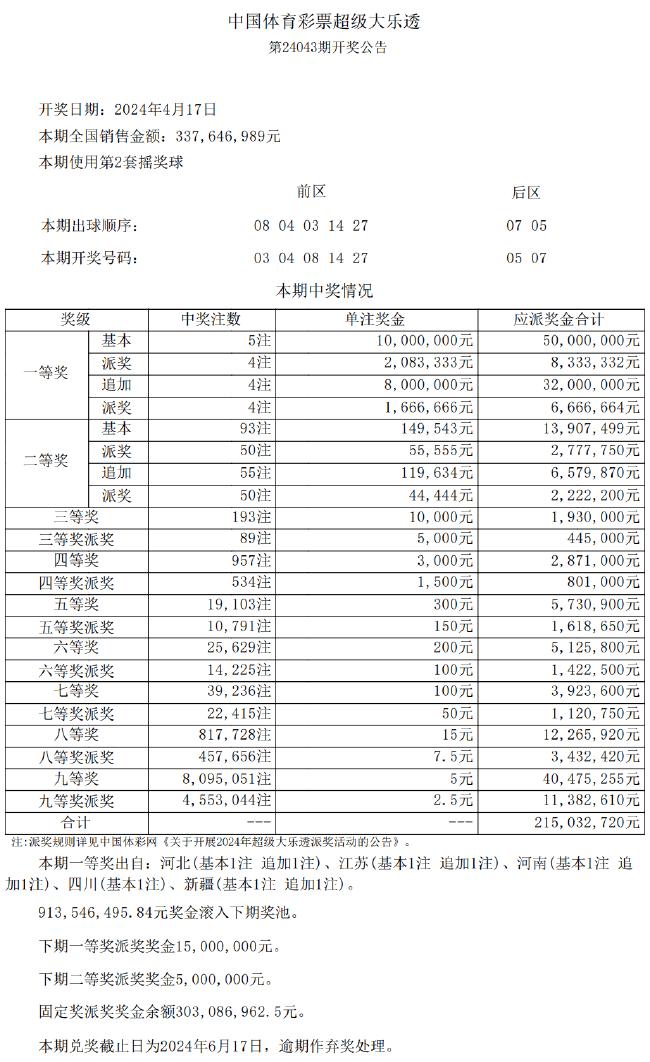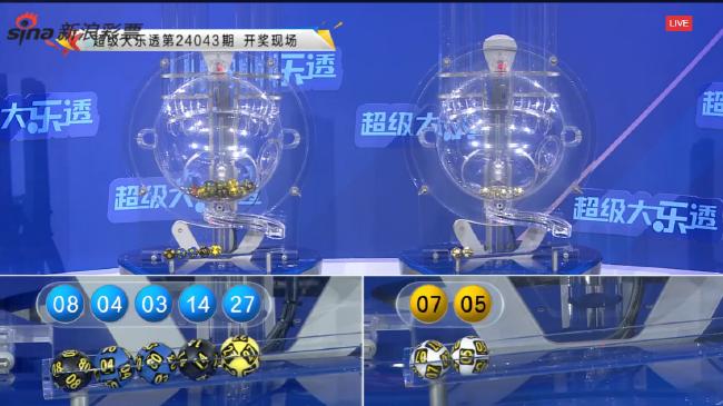 北京时间4月17日晚,体彩超级大乐透第24043期开奖,同时本期也是大乐透10亿大派奖的第14期。当期开奖号码为前区03 04 08 14 27,后区05 07。