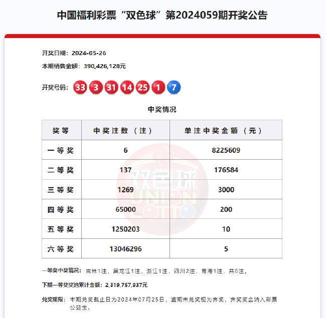 22:10 本期一等奖开出6注,单注奖金822万元,6注头奖分落四川(2注)、吉林、黑龙江、浙江、青海;二等奖开出137注17.6万余元。本期双色球全国销量为3.90亿元,计奖结束后奖池余额为23.19亿余元。
