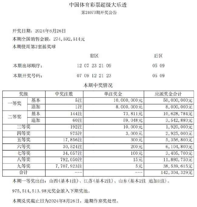 北京时间6月26日晚,体彩大乐透第24073期开奖,当期开奖号码为前区07 09 12 21 23,后区05 09。
