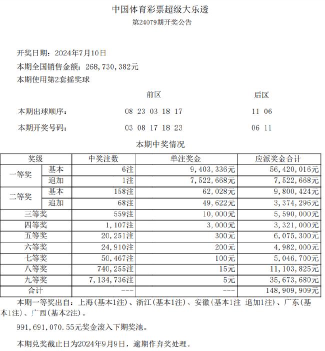 北京时间7月10日晚,体彩大乐透第24079期开奖,当期开奖号码为前区03 08 17 18 23,后区06 11。